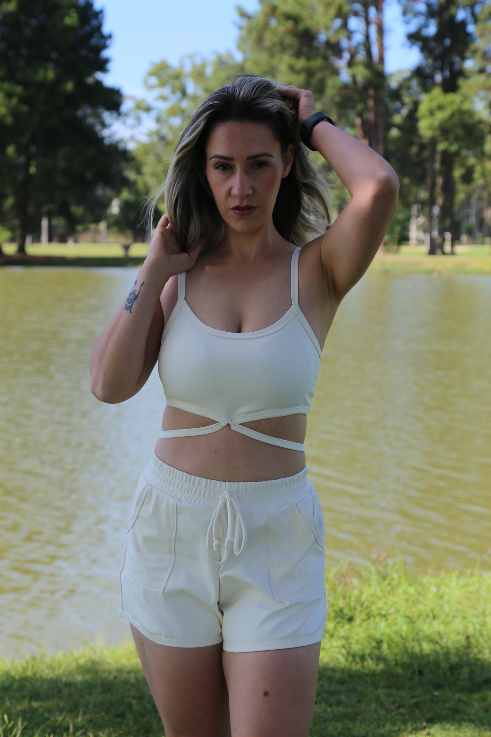 Composto pelo Shorts soltinho, que possui elástico na cintura, bolsos bem amplos nas laterais e pelo Top de alcinha, que possui bojo e também um detalhe de amarração na parte de baixo do top, deixando o look bem despojado, o top também possui bojo, com abertura para a retirada.